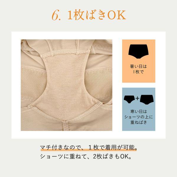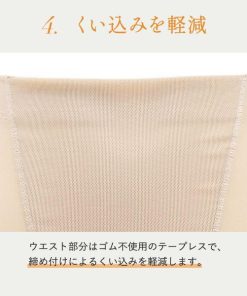 フロント部分には伸びにくい生地を使用し、お腹もキュッと押さえます。身生地は肌滑りがよい素材です。裾はヘム仕様でアウターにひびきにくく、めくれ上がりにくいので安心。クロッチ付きで1枚ばきOKなのも嬉しいポイントです!